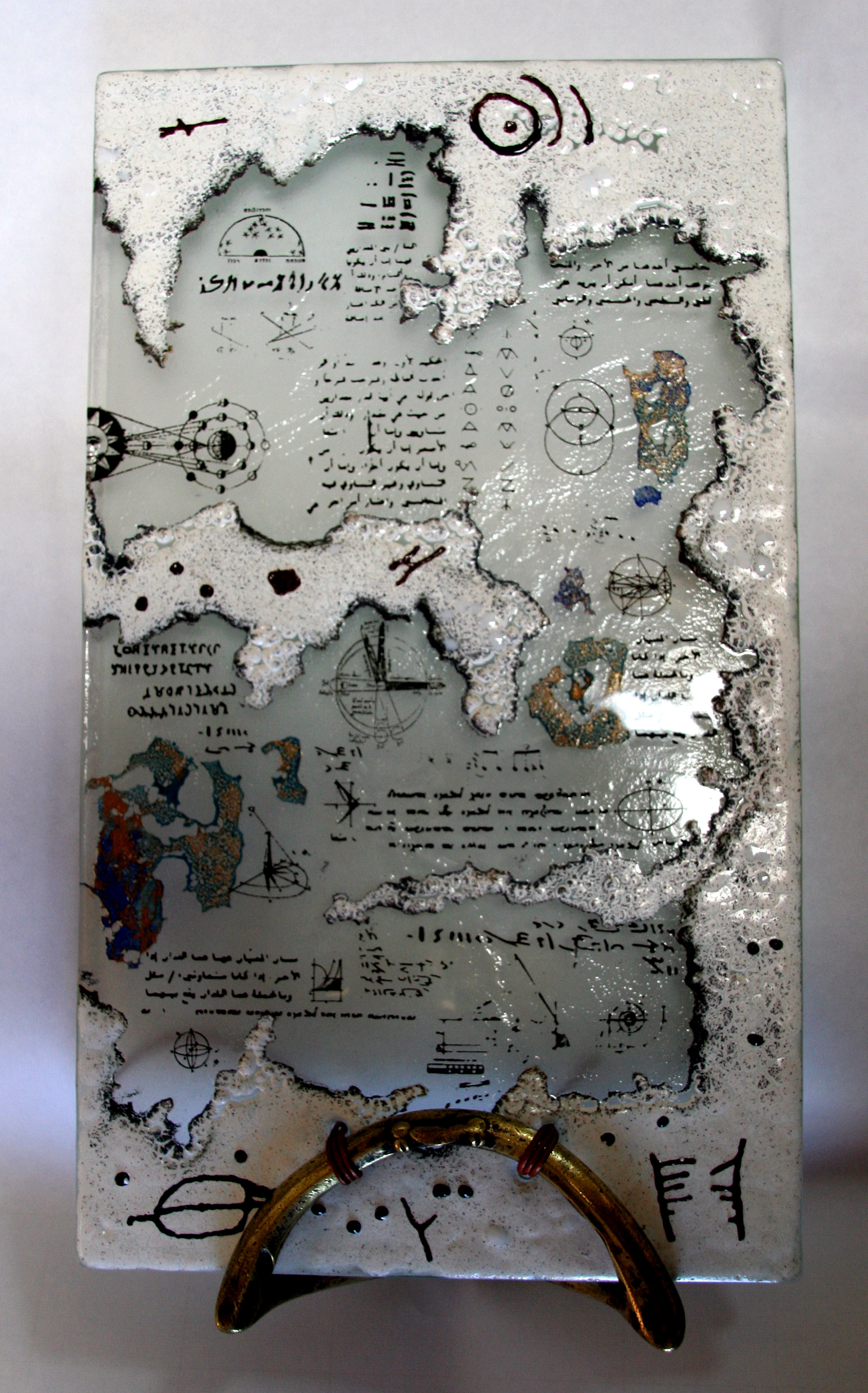 Je vis et je travaille dans l'Hérault et je réalise des panneaux de verre émaillés de noir ou de blanc, puis gravés, ou travaillés en sérigraphie d’émaux. J’y inclus des métaux, or, argent, cuivre, et des pâtes de verre.